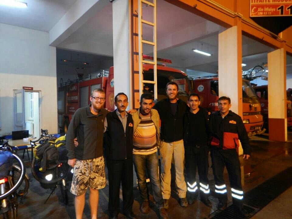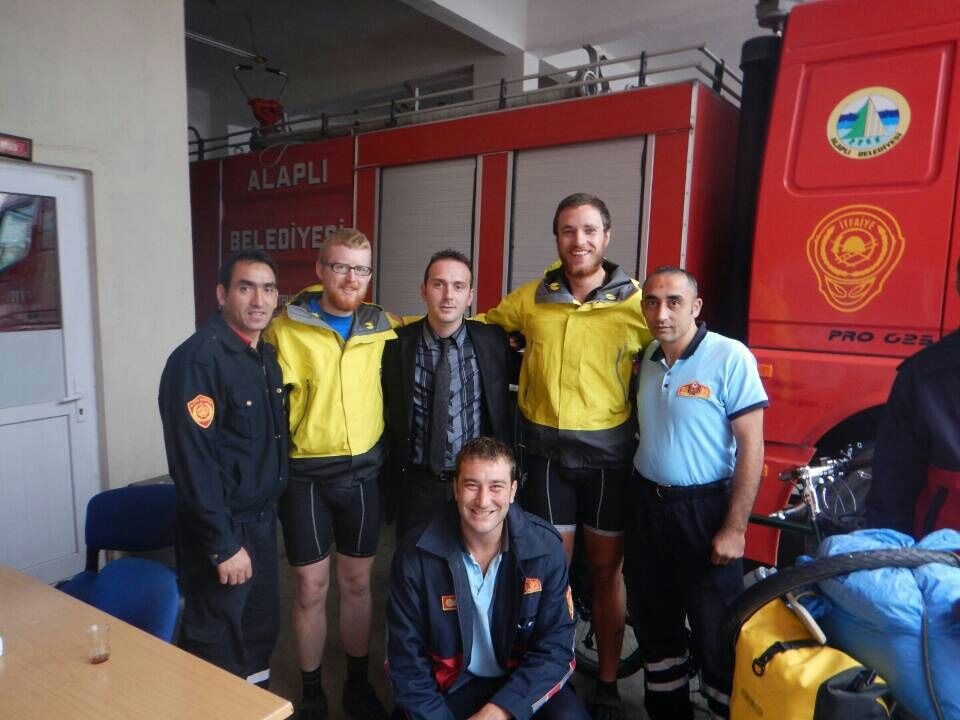 Mehmet explained that we had needed the chief’s approval to stay the night in town without being officially checked into a hotel, and that we were now off to spend the night at the fire station with one of his old mates. He apologised for not being able to host us himself, explaining that he lived with his parents. Were we hungry? More phone calls. So when we arrived, not only were we introduced to the entire brigade and given a tour, but the head of the local political party showed up to shake our hands and our takeaway dinner arrived in a police car. Not bad for a game of tiles in a tea garden!!! We were swiftly shown to the showers (which ironically had no cold tap – some really do like it hot) and spent the rest of the evening chatting with the brigade. Mehmet, something of a hero figure, stayed around until the end of the brigade’s midnight shift to translate. We can confirm that there were no fires in Alapli that night as we slept undisturbed in the mess room until the morning. After eating the breakfast spread which was laid on by our firemen hosts we cycled away eastwards, wondering if this kind of luck could possibly hold.