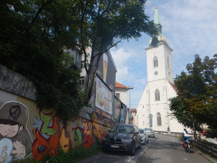 Looking up at the Blue Church, Bratislava, 7 Aug