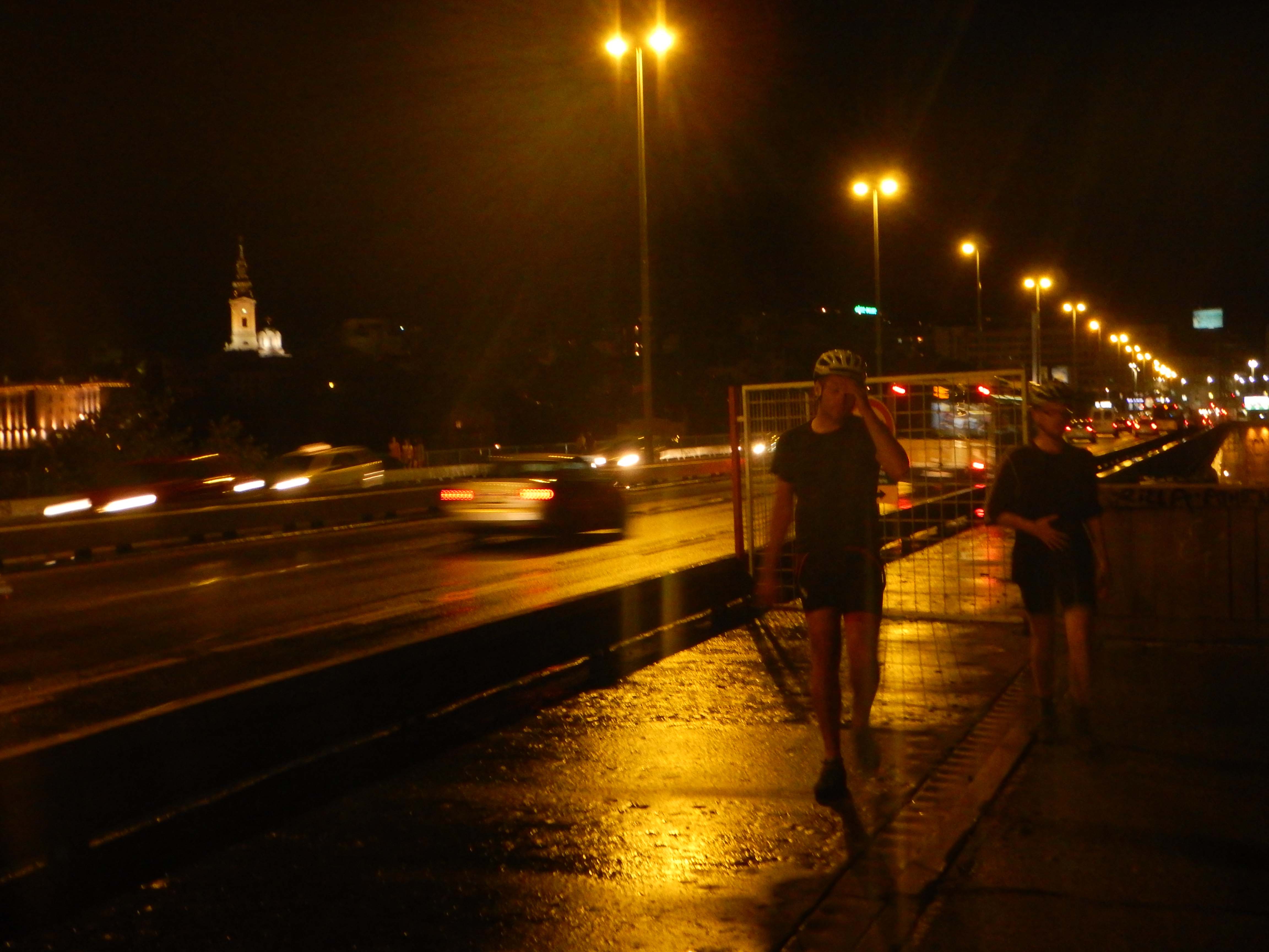 20140814 Jumping the barrier across the bridge in our entry to Belgrade