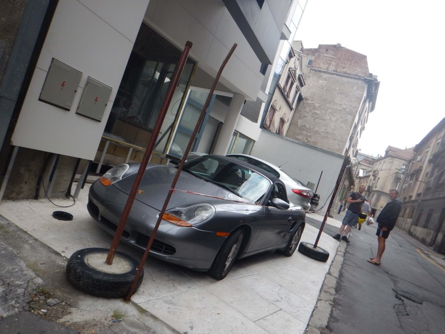 Fancy cars next to much poorer workers, Belgrade, 16 Aug