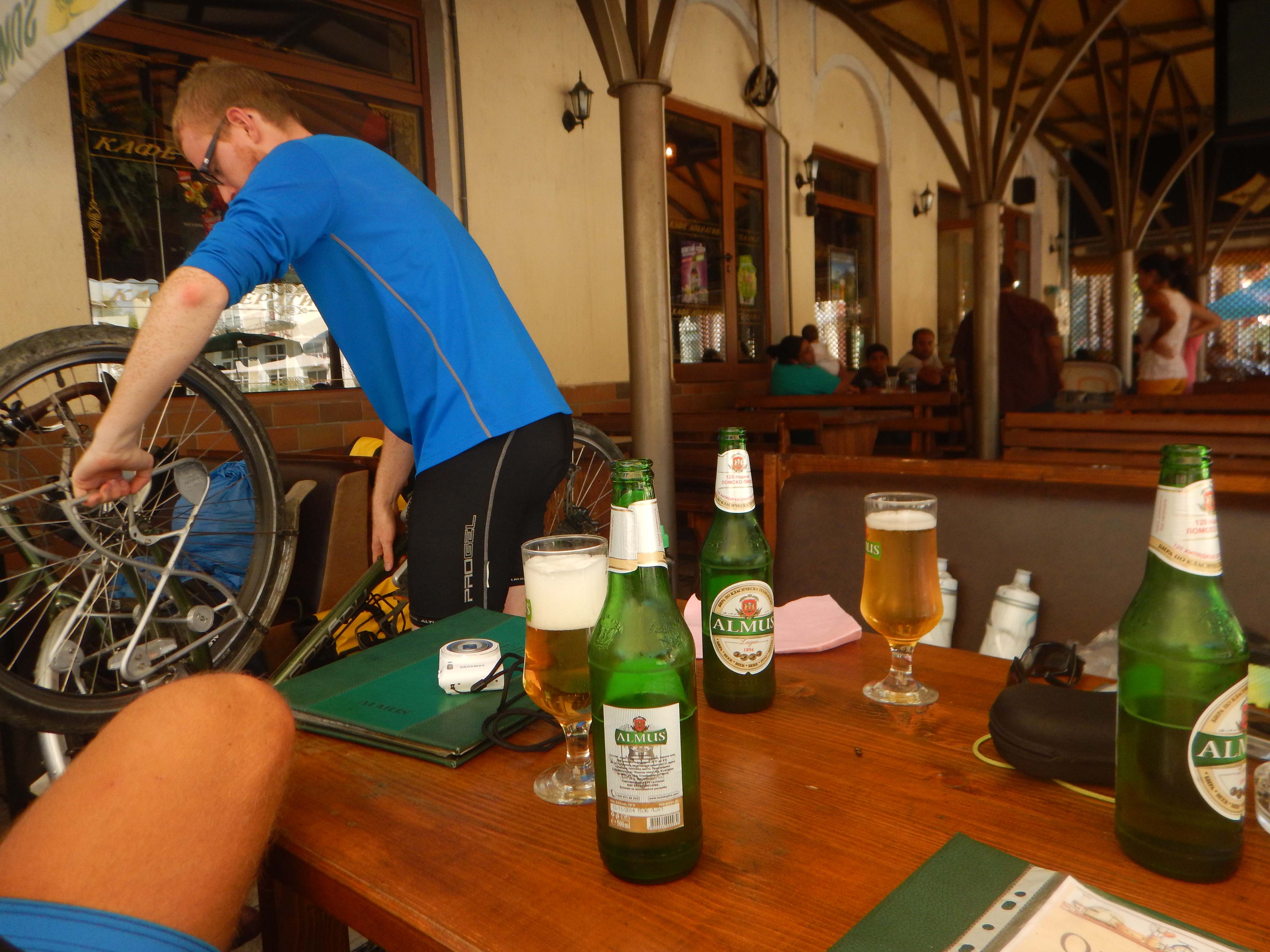 Bike maintenance over lunch in only restaurant open in Lom, 21 Aug