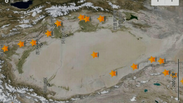 The stars mark where we slept across Xinjiang. Spot the Taklamakan crossing star.